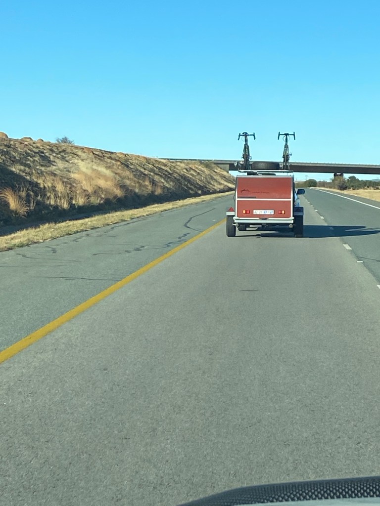 On the road ahead we saw a Tripper! A stunning red Limited Edition with two bikes on the roof rack. We took a photograph and sent it to Sanette – each Road-Tripper trailer is made specifically to client specifications. Sanette identified our fellow Tripper Travellers and after introducing ourselves at the next PetroPort we chatted through breakfast; Swapping numbers and getting a photograph to commemorate the happy coincidence.